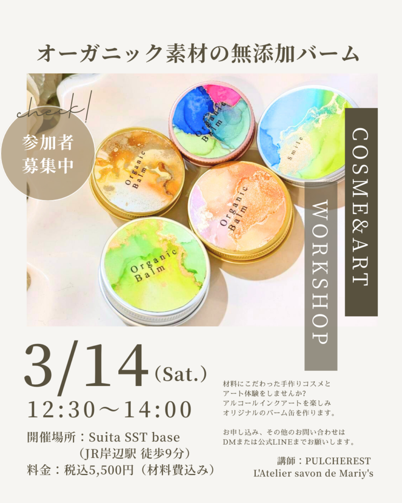 今回も、まりこ先生 をお迎えして、 保湿バーム作り × アルコールインクアートによるラベル制作 がセットになった特別内容です!